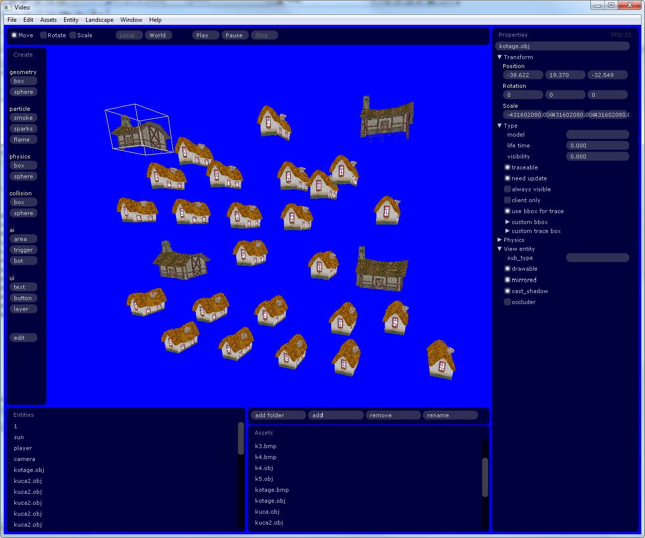 Editor is developing very fast. A lot of things are complete - window layout management, editing of object’s type, assets management (drag and drop assets to scene from asset tree, renaming, deleting etc), project save/load etc.