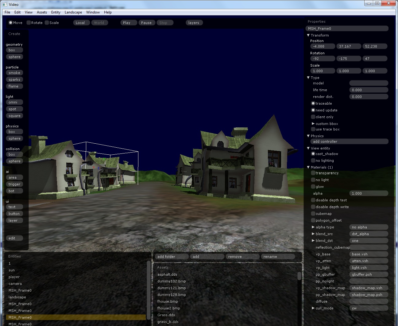 Deferred shading restored, shadow maps, landscapes by clipmaps, translation and rotation of entities by mouse with restriction by selected axis (x, y, z).